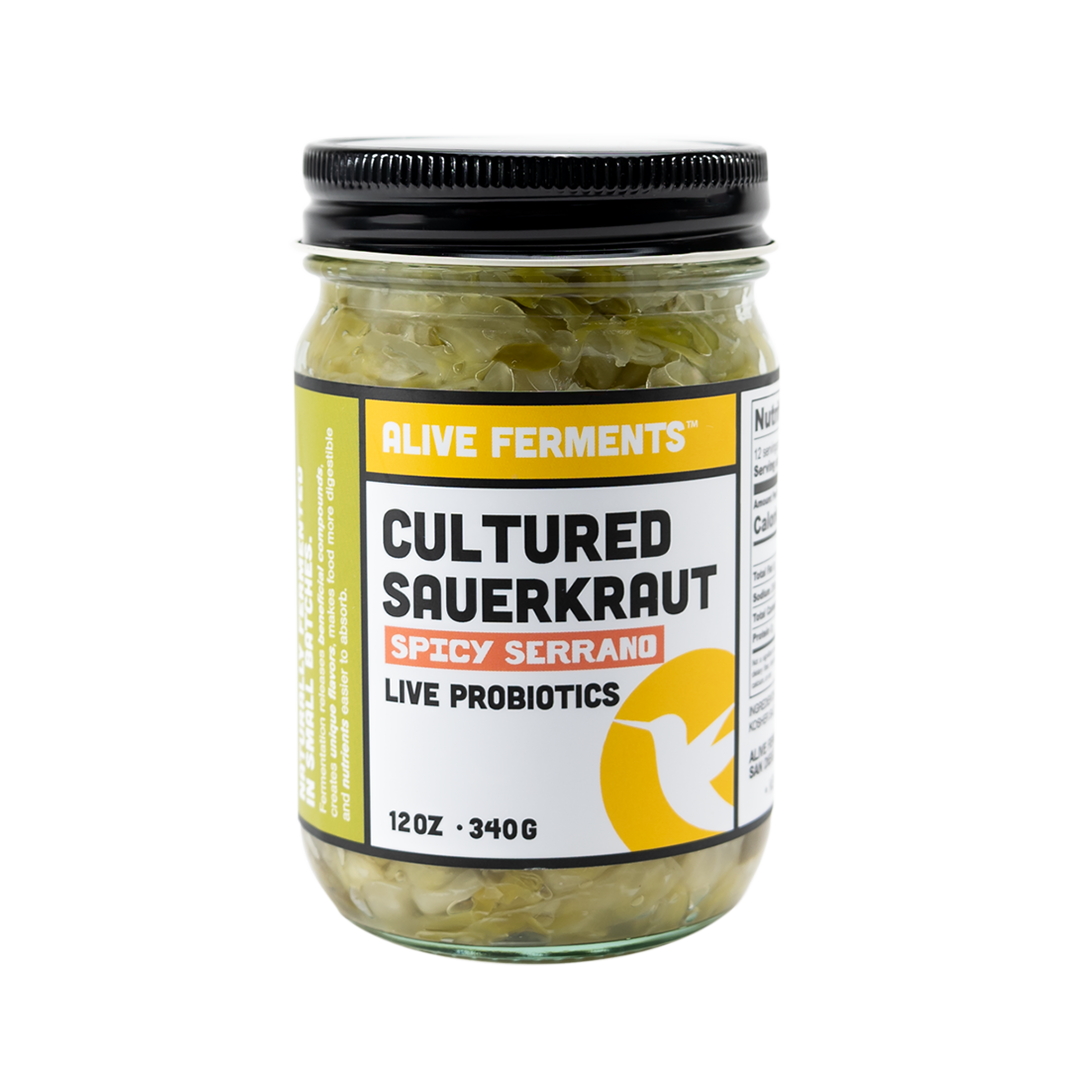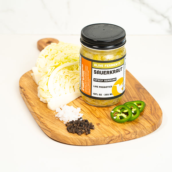 Our Serrano Sauerkraut has a distinctly tangy, sour, and slightly salty flavor profile that ends with a nice spicy kick sure to wake up your taste buds! During fermentation, natural lactic acid bacteria break down the cabbage’s sugars, producing a slightly acidic flavor reminiscent of pickles. The tangy taste and the heat of the serrano peppers are balanced by the subtle sweetness of the cabbage, and complemented by briny, earthy undertones.