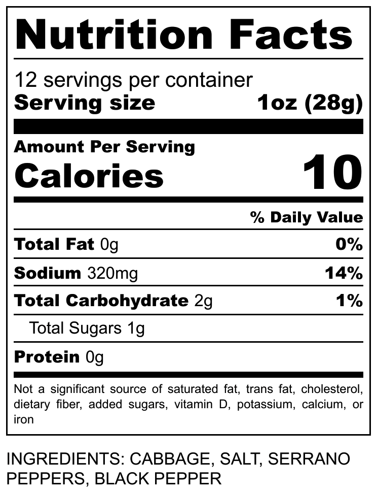 Cabbage, Salt, Serrano Peppers, Black Pepper.